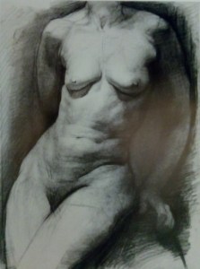 “One of the most important things to learn as a figurative artist is how to create a sense of strong light on the form. This helps with modeling, as it provides a greater range of values to work with… The figure should be modeled uniformly, meaning the value range in one area should be working from the same value range as another area. If the light source is close to the model’s head, then her feet should not be lit as strongly as her face. Controlling the light, understanding it, is just as important as getting proportions or anatomy correct.”