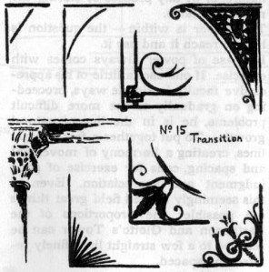 TRANSITION. “Two straight lines meeting in opposing directions give an impression of abruptness, severity, or even violence; the difference of movement being emphasized. If a third line is added, as in the sketches below, the opposition is softened and an effect of unity and completeness produced.”