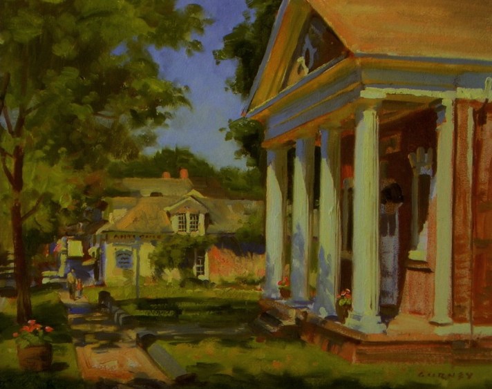 “In the sketch of the library in Millbrook, New York there’s plenty of blue color in the cast shadows on the sidewalk, for example. But planes in shadows that face downward are different because they pick up the warm reflected color of illuminated surfaces below them. You can see this effect in the white pediment above the columns. Where the projecting forms face downward, they’re distinctly warm, not blue at all.”
