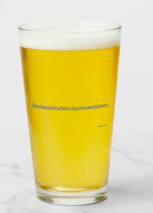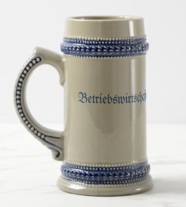 English speakers are both fascinated and baffled by long German compound words. The word Betriebswirtschaftsbuchzusammenfassungen wraps around this beer stein (Bierkrug) or beer glass. The word means business book summaries. Something to parse and ponder while you enjoy your beer. Zum Wohl! (Cheers!)